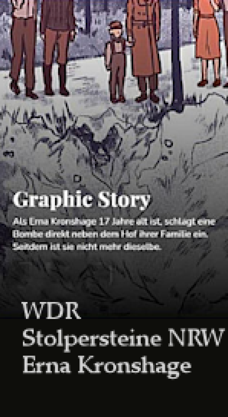 bewahren das Andenken an Erna Kronshage. Die »klassischen« Memorials wie Gedenktafel und Stolperstein werden ergänzt durch Informationen dazu von Beiträgen auf verschiedenen Social-Media-Plattformen, eine Graphic-Kurzstory, eine szenarische Theaterarbeit in Anlehnung an die Biografie, sowie die verschiedenen Vortragsformen für ganz unterschiedliche Zielgruppen, die das Opferschicksal Ernas beleuchten,