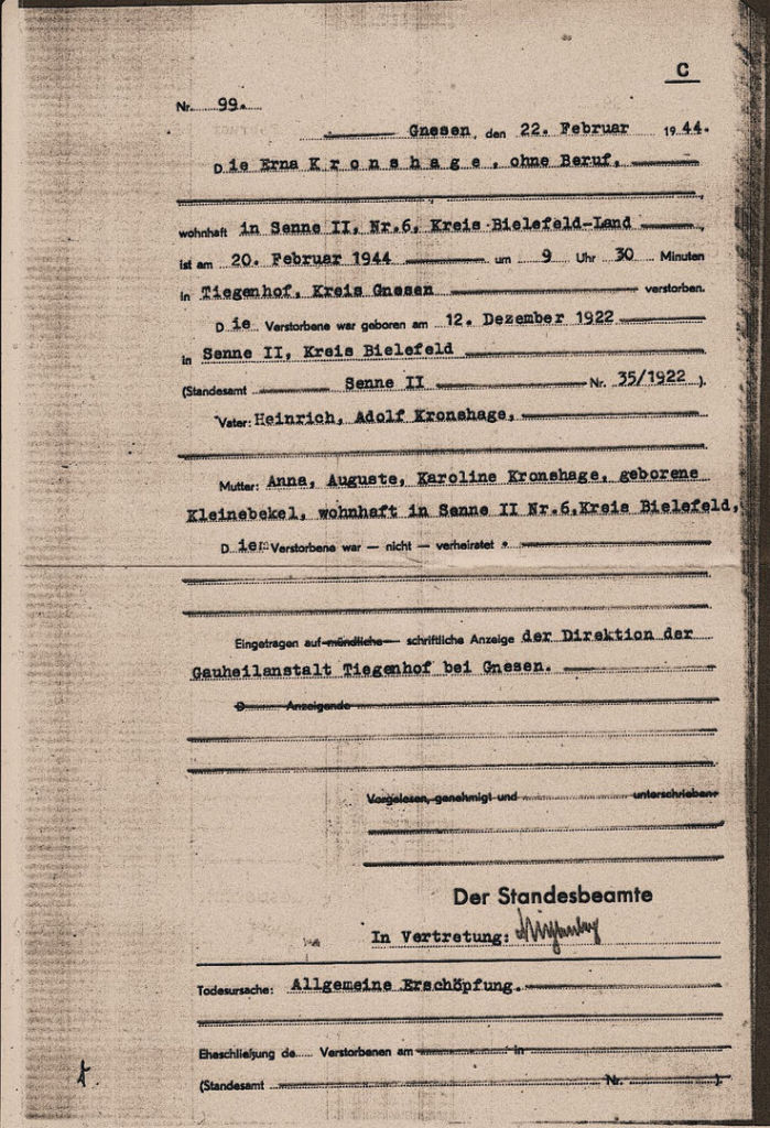 Ein Sterbetagebuch der "Gauheilanstalt Tiegenhof"/Dziekanka-Gniezno, das sich im MUZEUM MARTYROLOGICZNE W ŻABIKOWIE in Luboń-PL befindet, setzt in der hier am 23.10.2023 eingetroffenen Kopie aus einem der dort vorhandenen akribisch geführten Sterbetagebücher das Ableben meiner Tante Erna Kronshage augenscheinlich auf den "19.II.[2.] 1944" fest -das Sonder-Standesamt in Tiegenhof/Gnesen beurkundet jedoch den "20.2.1944, um 9 Uhr 30" als Sterbedatum (s.o.) ... - zusätzlich ist vermerkt, dass der Leichnam am „24.II.44“ in einem „Eig. Sarg [nach]Westen“ verbracht wird. Die Konfession ist mit "evgl.“ vermerkt: