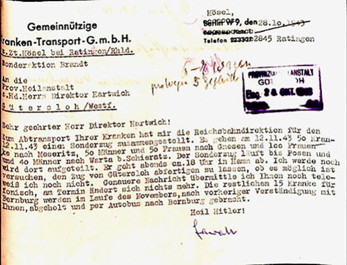 „Hösel bei Ratingen“ (statt Berlin) vom 28.10.43 – der „zentralen“ T4-Tarn-Transportorganisation - an Direktor Hartwich aus Gütersloh, wird zur Kennzeichnung der „Abtransports“-Maßnahme am 12.11.1943